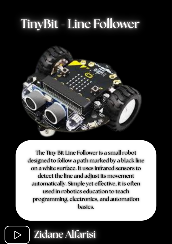 The Tiny Bit Line Follower is a compact educational robot designed to follow a black line on a white surface using infrared sensors. These sensors detect the contrast between the line and the background, allowing the robot to adjust its wheels and stay on track. It is commonly used in beginner robotics projects because it demonstrates core principles of automation, sensor technology, and programming in a simple, hands-on way. With its small size and easy-to-understand mechanics, the Tiny Bit Line Follower helps students learn how robots can perceive their environment and respond intelligently to it.